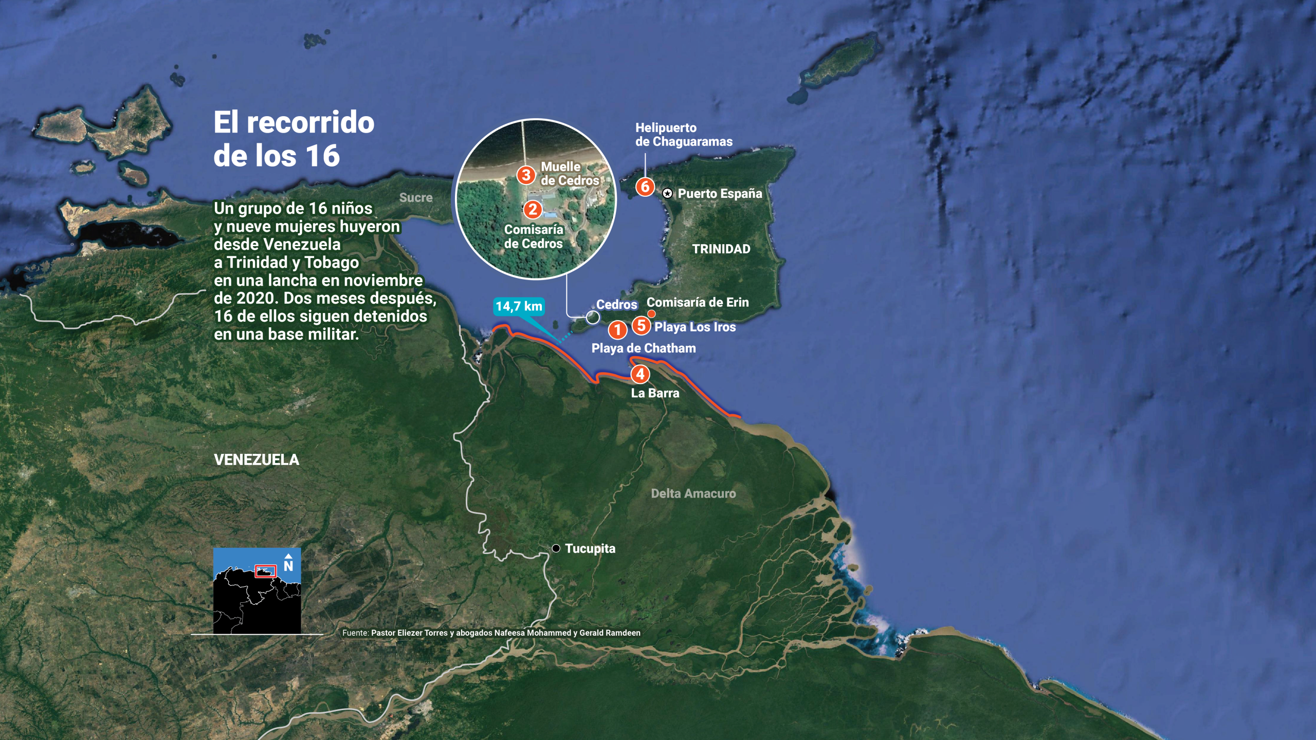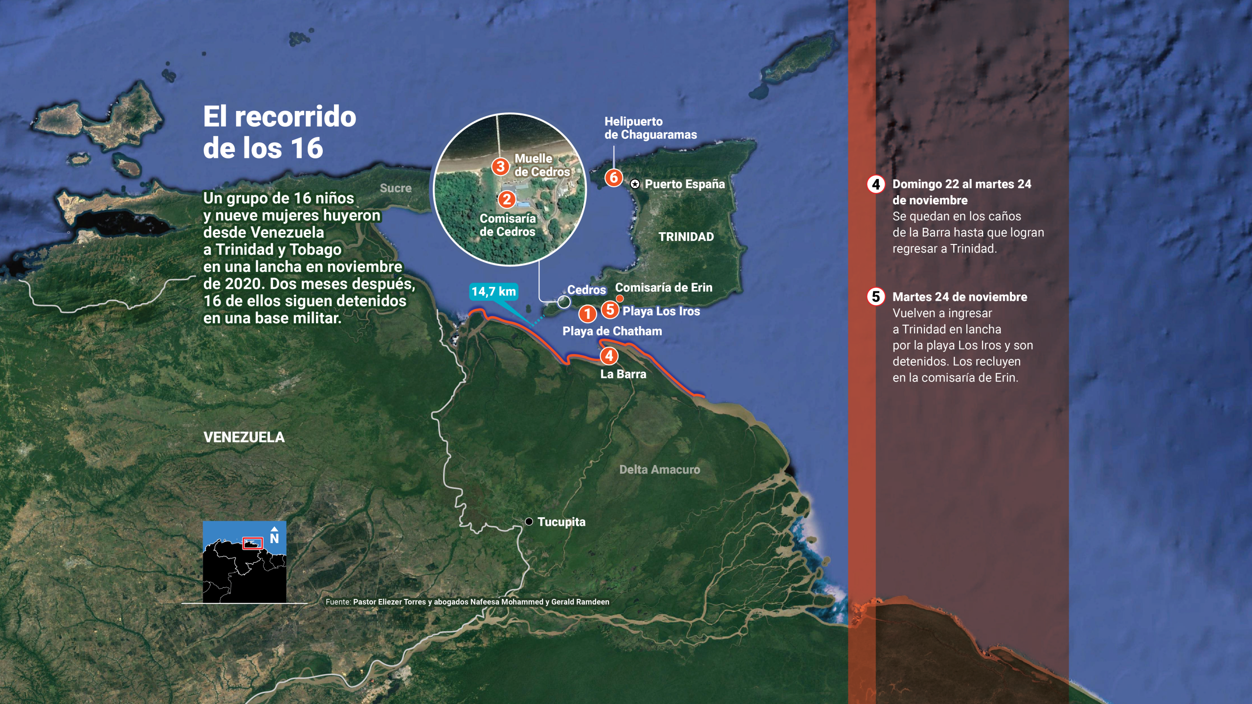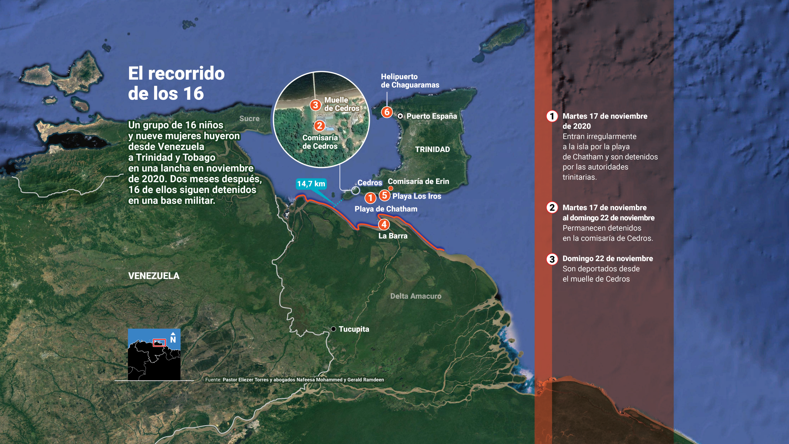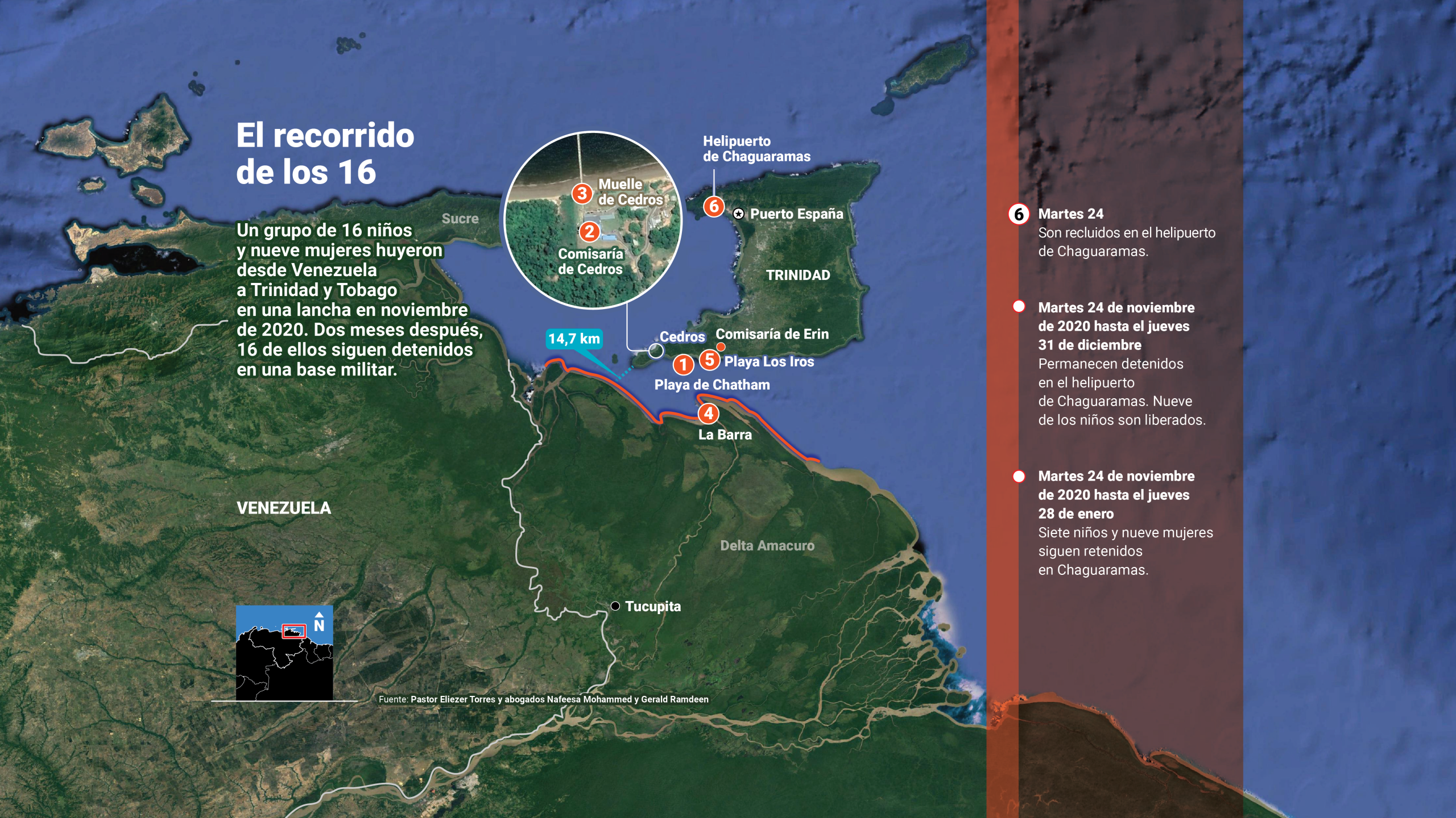 Lo primero fue ayudar a Nafeesa Mohammed, la abogada trinitaria que aceptó el caso, a hacer una lista con los nombres, apellidos y edades de los 16. También recabó información sobre el estatus migratorio de cada familiar en Trinidad, a fin de presentar el caso ante el juez que tomaría la decisión de autorizar o rechazar la estadía del grupo en la isla. La investigación le permitió al pastor hacerse una idea de quién era quién cuando llegó al calabozo.