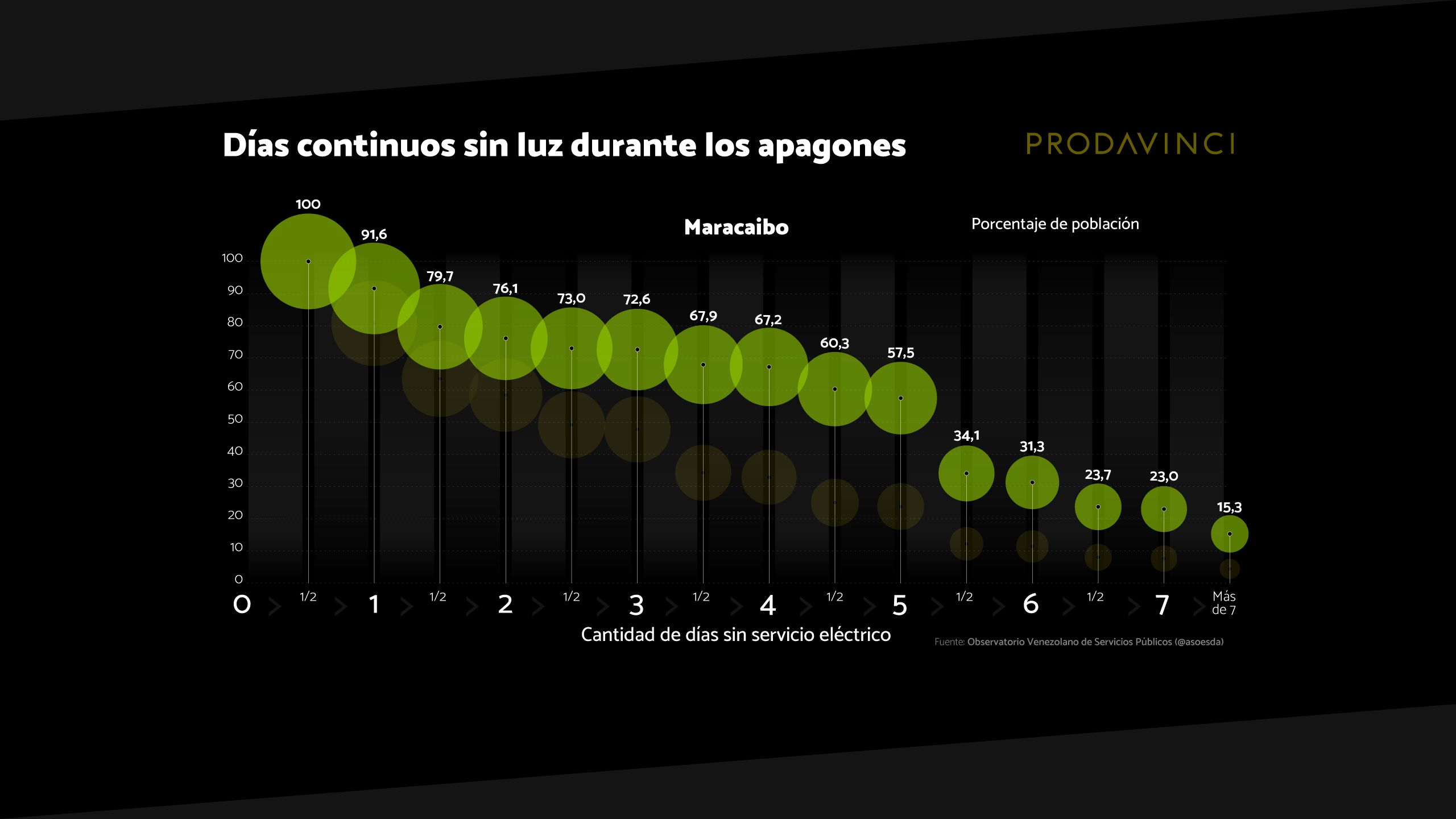 En Mérida y Maracaibo, la población enfrentó las interrupciones más largas. Mérida estuvo 4,6 días sin electricidad en promedio. Sin embargo, en Maracaibo casi la cuarta parte de los habitantes no tuvo luz antes de los 7 días.
