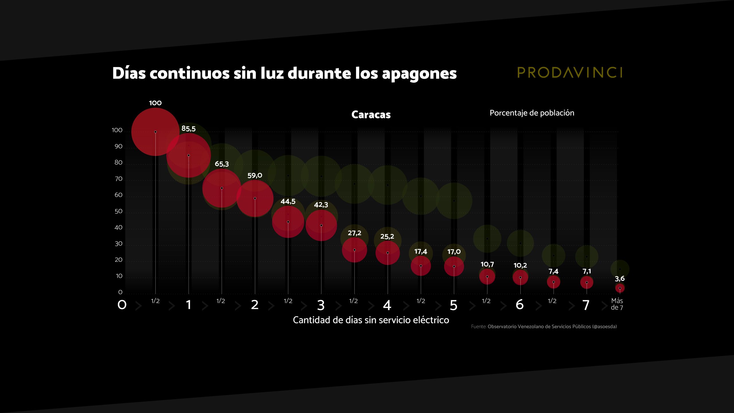 Tres apagones masivos dejaron sin electricidad hasta 21 estados del país en marzo de 2019. Casi la mitad de los venezolanos permaneció al menos tres días continuos sin el servicio, en diez zonas metropolitanas del país. Prodavinci presenta una encuesta elaborada por el Observatorio Venezolano de Servicios Públicos (@asoesda), que evalúa la duración de estas interrupciones, cómo se sintieron los afectados y a quién responsabilizan.