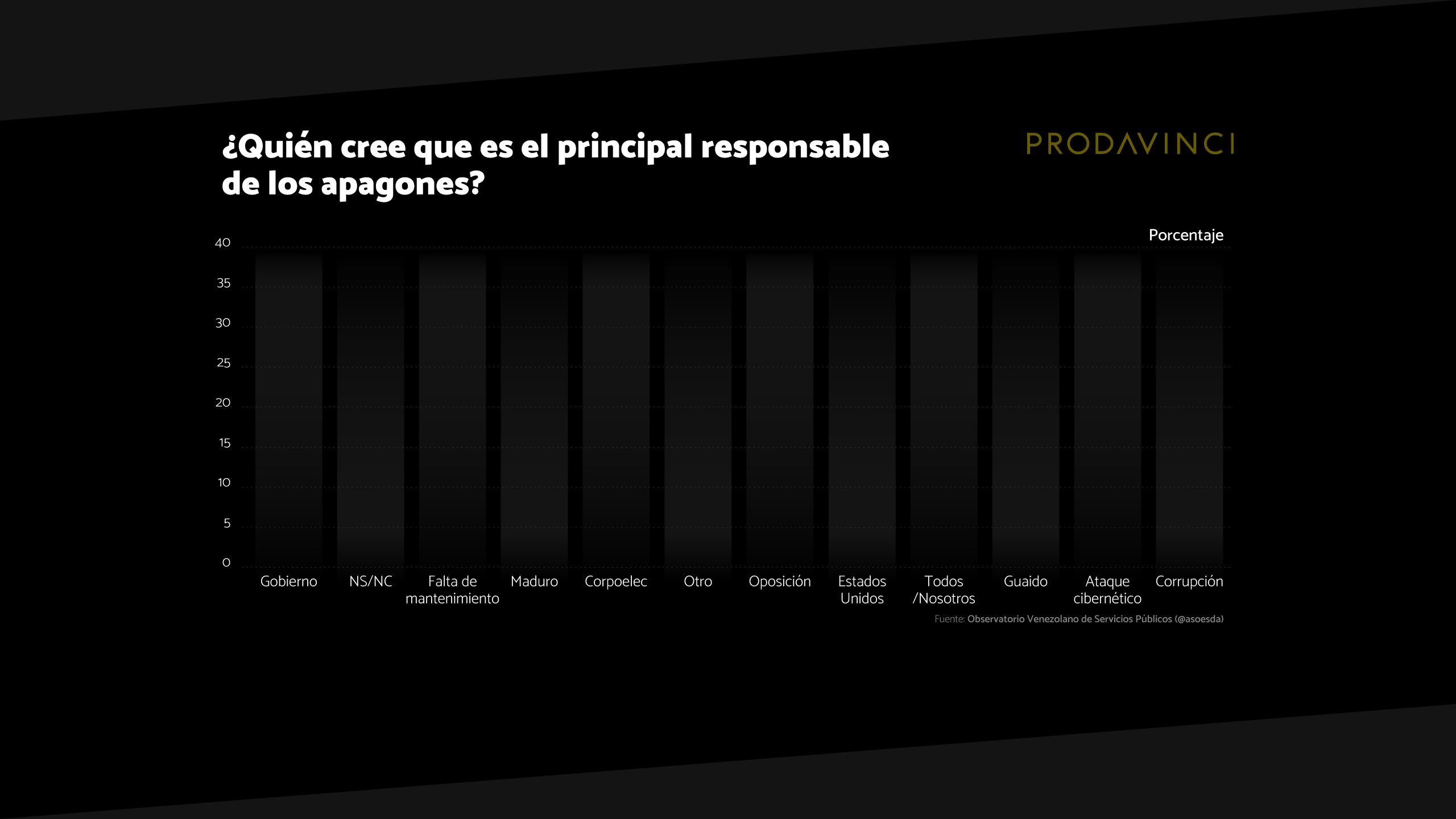 Dos de cada cinco encuestados responsabilizó al gobierno, el 5,4% a Nicolás Maduro de forma directa y 4,2% a Corpoelec. Una vez más, un tercio de los entrevistados afirmó no saber a quién responsabilizar. Uno de cada diez personas dijo que la falla del servicio ocurrió por falta de mantenimiento.