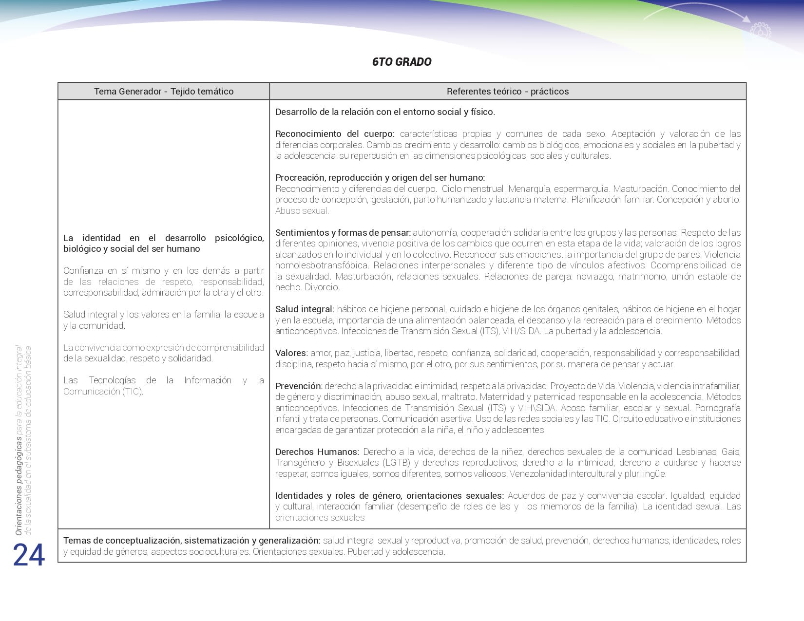 Las Orientaciones pedagógicas en el subsistema de educación básica son una guía para los docentes. Su última actualización se presentó en 2019 e incluye las infecciones de transmisión sexual (ITS), la diversidad sexual, la autoestima y la violencia en el noviazgo entre los referentes teórico-prácticos para las clases, especialmente en grados de educación media y en los últimos niveles de primaria. Hoy, la EIS es obligatoria en el país desde preescolar hasta educación media. La medida se publicó en la Gaceta Oficial 42.063, el 5 de febrero de 2021.